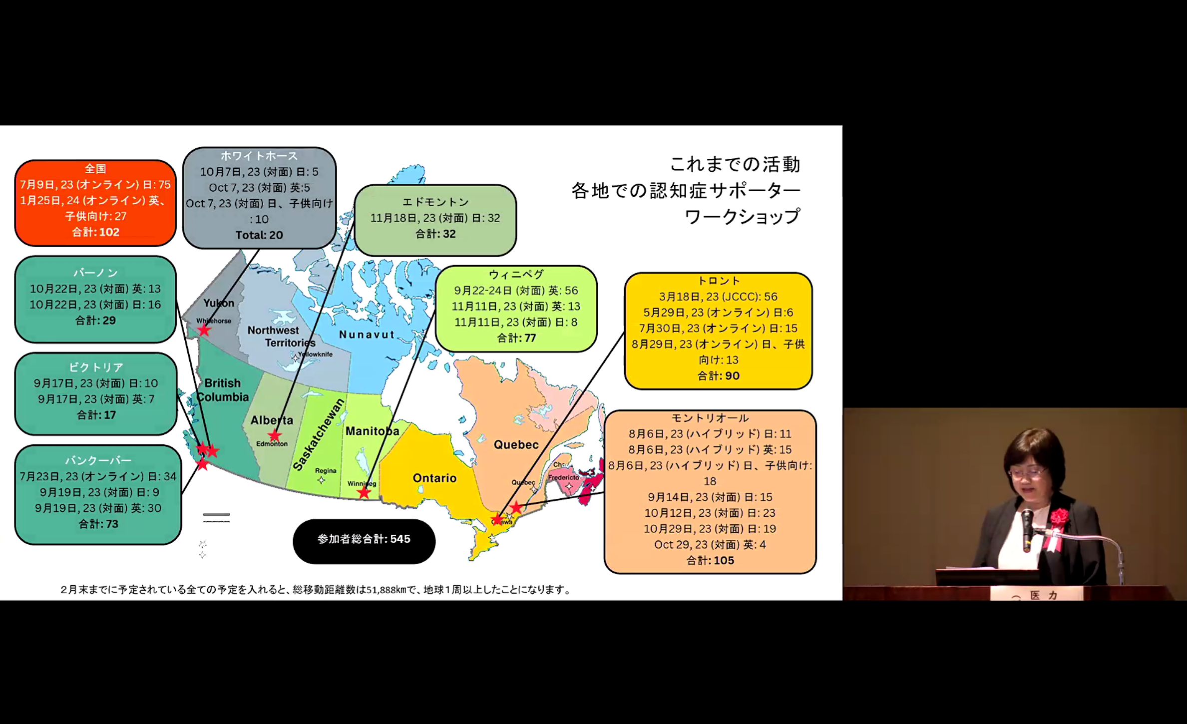 JAMSNETカナダのプロジェクトでは、①認知症の予防、②認知症に関する偏見の軽減、③認知症の方たちとの共存生活の促進(認知症フレンドリーコミュニティー)を目指して、カナダ各地の日系パートナー団体と連携して、認知症サポーター・ワークショップが開催されました。ワークショップは実際に対面で行うものとオンラインで行うものを併用しました。特筆すべきは、それまではワークショップ等が行われたことのない小さな町にも傳法代表率いるチームが赴いて認知症サポーター・ワークショップを行ったことです。 太平洋岸から大西洋岸まで各地を移動した訳ですが、総移動距離は、約5万2000kmで地球一周に相当します。「数字は嘘をつかない」と言ったのはディズレイリー英国首相ですが、この数字は2つの事を雄弁に語ります。一つはカナダの国土の巨大さです。もう一つは、JAMSNETカナダの認知症チームの使命感と情熱と実行力です。本当に頭が下がります。