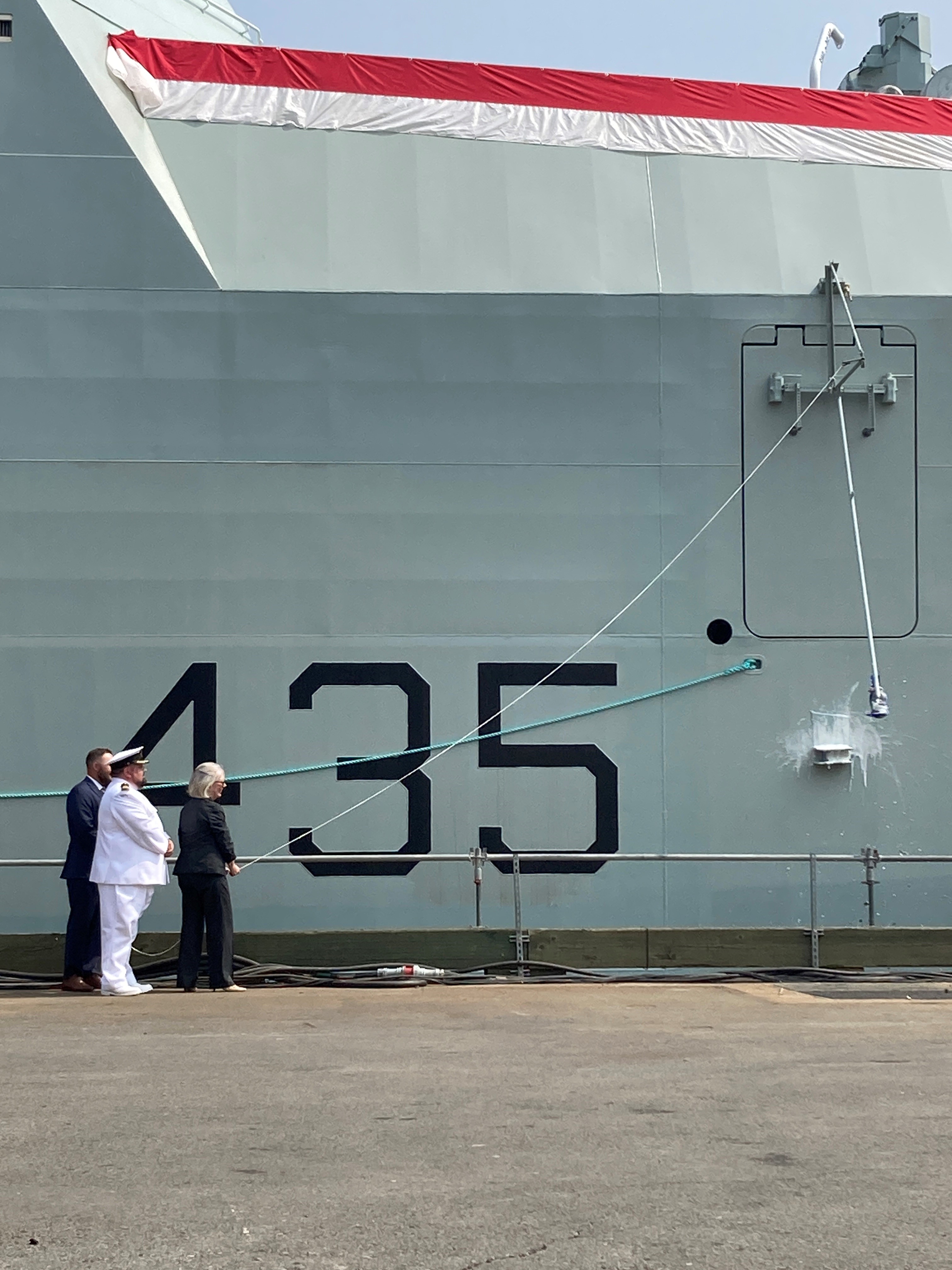 そして、海軍の伝統に則り、シップ・クリスニングの儀式が行われました。これこそ命名式の核心です。命名者であるアンダーウッド女史がロープを引っ張り、シャンパン・ボトルを新艦船の船側に打ち付けます。クラッシュ音とともに鮮やかなバブルが船側を流れ落ちます。と、同時に「I name you Robert Hampton Gray. Bless this ship and all who sail in it.」と宣言しました。満場の歓声が沸きました。快晴の中、その場にいる全ての人が笑顔でした。